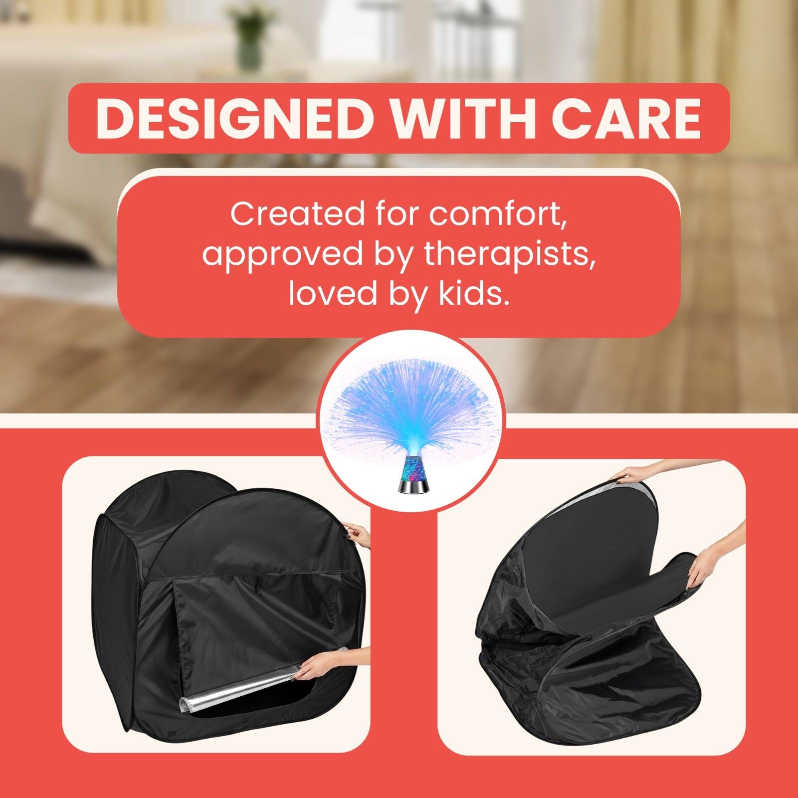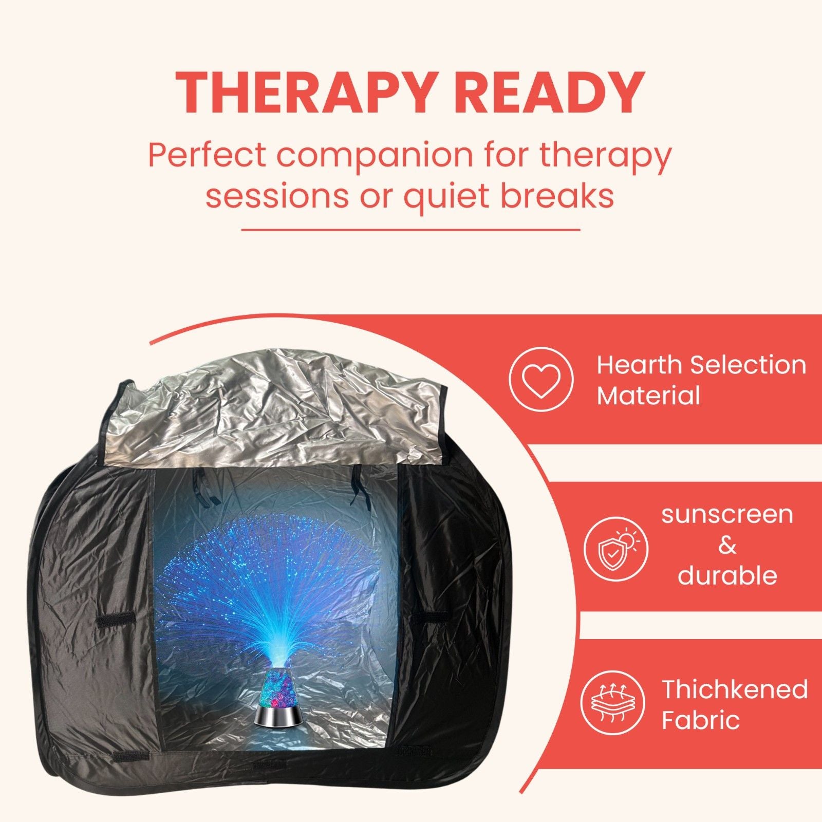 💡 The integrated fiber optic lights offer a captivating visual experience, projecting a gentle, colorful, and dynamic glow. This immersive stimulation can support self-regulation, encourage sustained focus, and promote a sense of tranquility – ideal for unwinding after a busy day or during moments of overstimulation. It's an excellent addition for cozy reading nooks, fostering imaginative adventures, or complementing guided play and therapy sessions. (Unlike basic tents, our integrated lights offer consistent, safe illumination without external projectors!)
