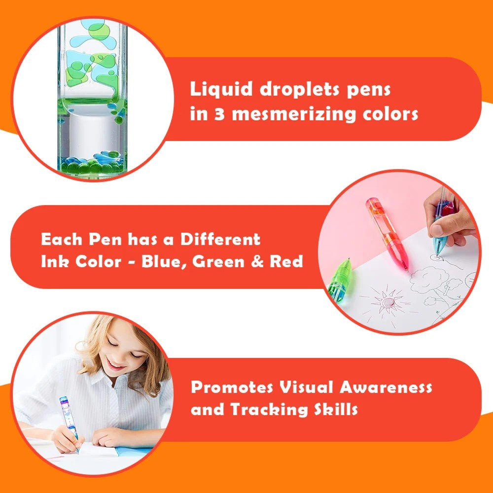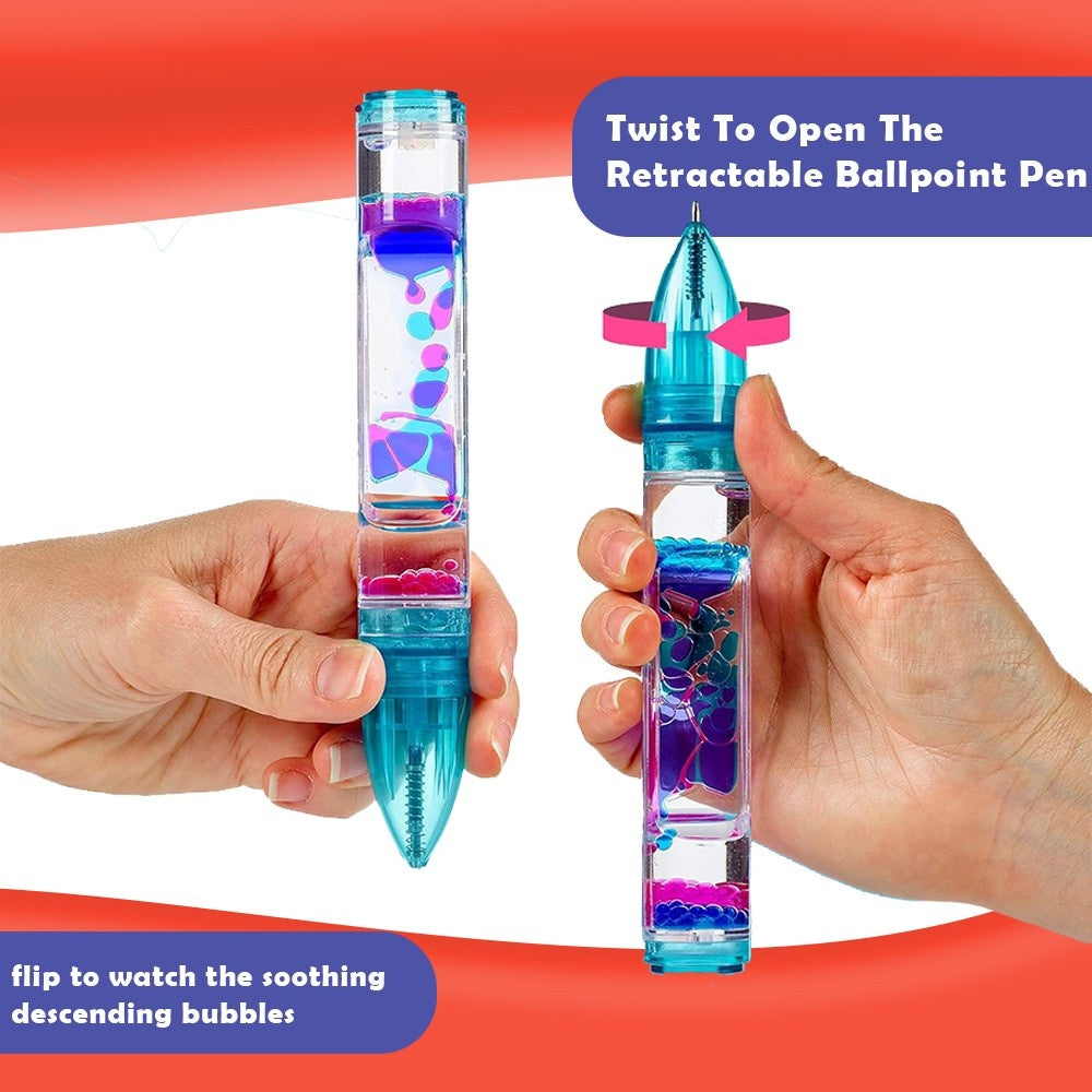 Make writing more relaxing with this unique pen, which combines a smooth writing experience with the mesmerizing motion of colorful, non-toxic liquid bubbles. Make writing tasks more relaxing with this functional pen that doubles as a calming sensory tool. Watch the colourful bubbles float inside as you write, helping to ease restlessness. Reduces Fidgeting During Tasks: Provides a simple, engaging visual element that helps keep hands busy and minds focused during writing or homework. Promotes a Sense of Calm: The gentle, floating motion of the colourful droplets offers a soothing visual input that can make tasks feel less stressful. Details: * 1 Pen * Material: Durable Plastic with Non-Toxic Liquid * Ink Colour: Black or Blue * Use: Functional pen and visual fidget tool.
