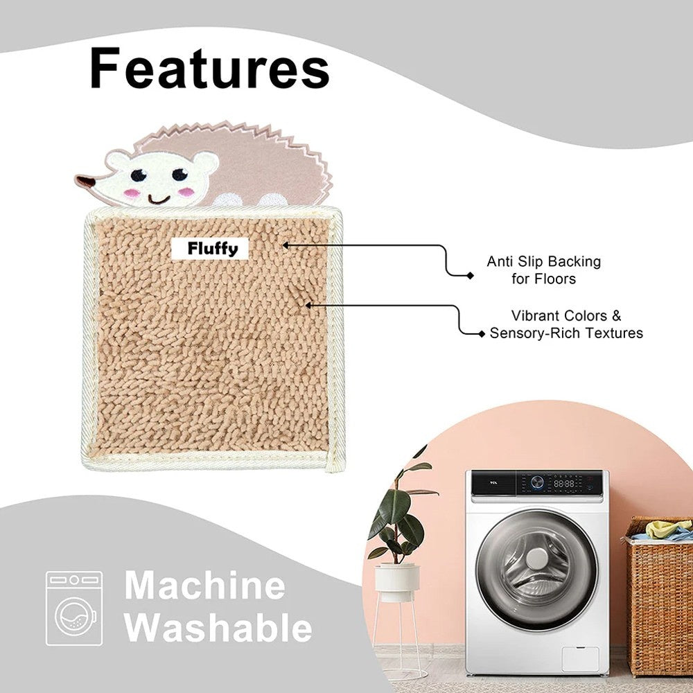 Each piece in the sensory mat for kids set features a different texture. There are soft, furry surfaces, smooth faux-leather squares, sequined panels, and gentle animal-themed edges. The gentle pressure from walking or playing helps children calm themselves and focus. Sensory play with this mat can support children struggling with sensory processing or focus.