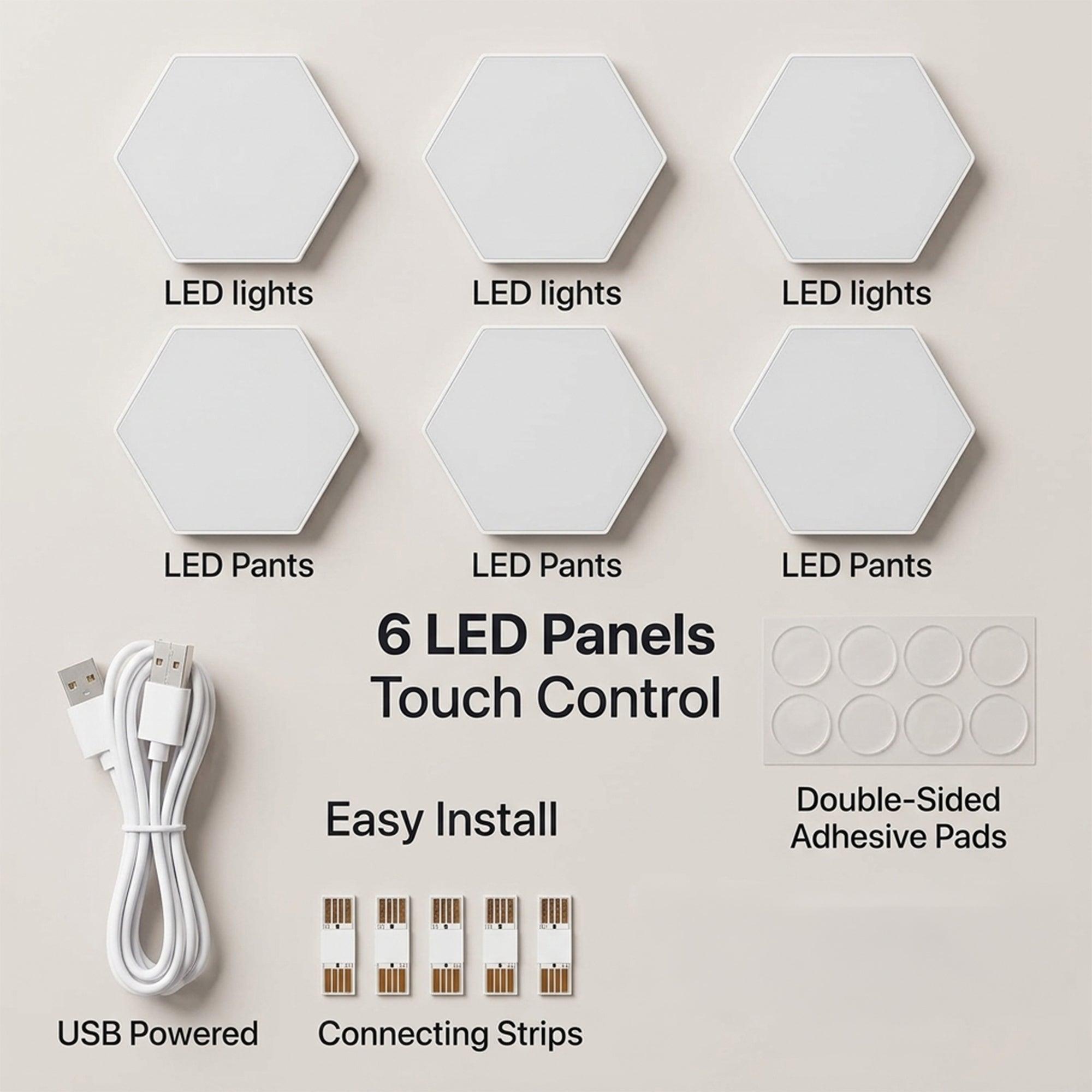 Setting up your Hexagon Touch Wall Lights is simple and requires no specialized tools. Start by planning your design on a flat surface, then use the provided double-sided adhesive pads to secure each 9cm panel to the wall. Connect the panels using the included USB connecting strips; these strips act as bridges, allowing power to flow from one hexagonal unit to the next. Once your pattern is complete, plug the main USB cable into a power source. To operate, simply tap the surface of any panel to turn it on, off, or cycle through a vibrant spectrum of colors.