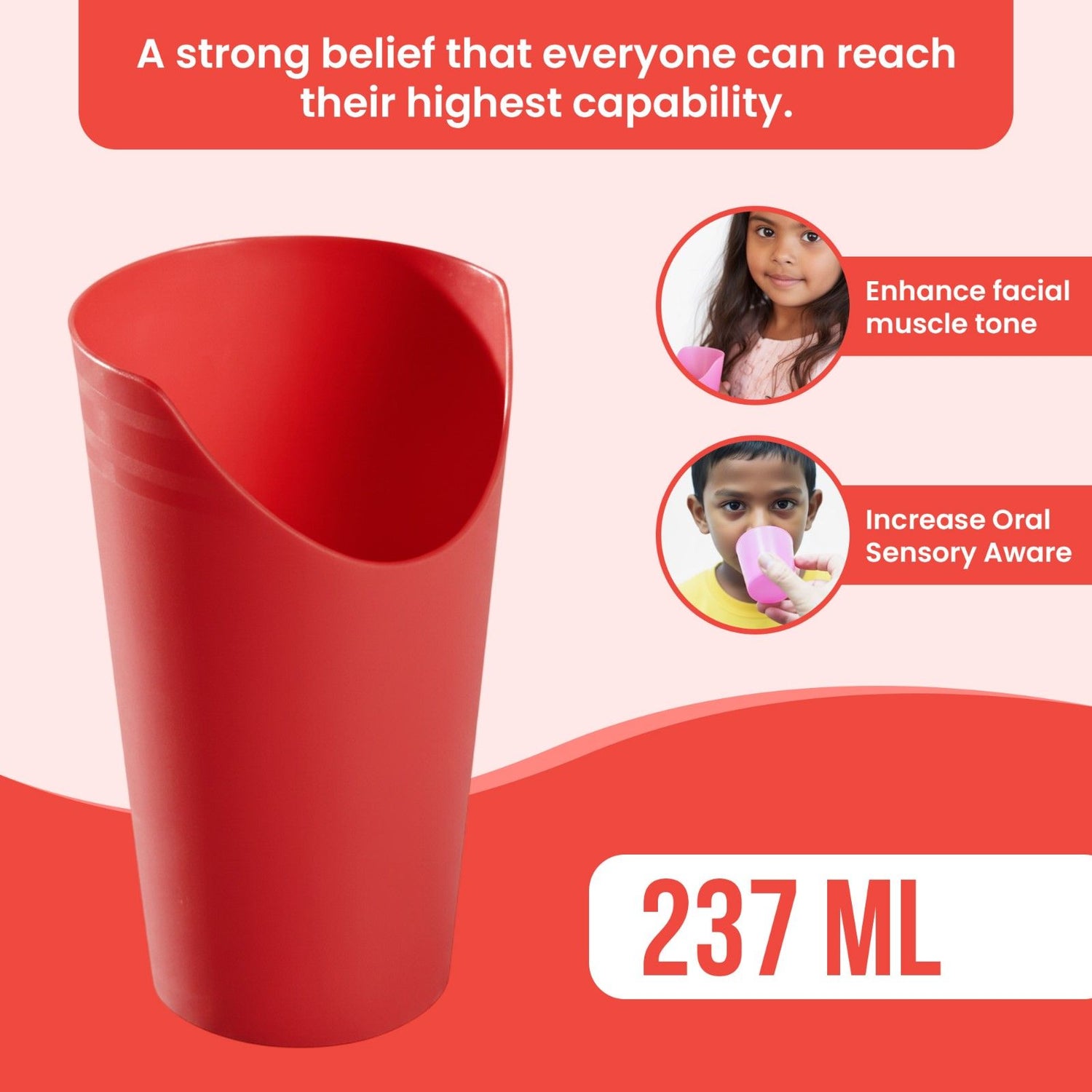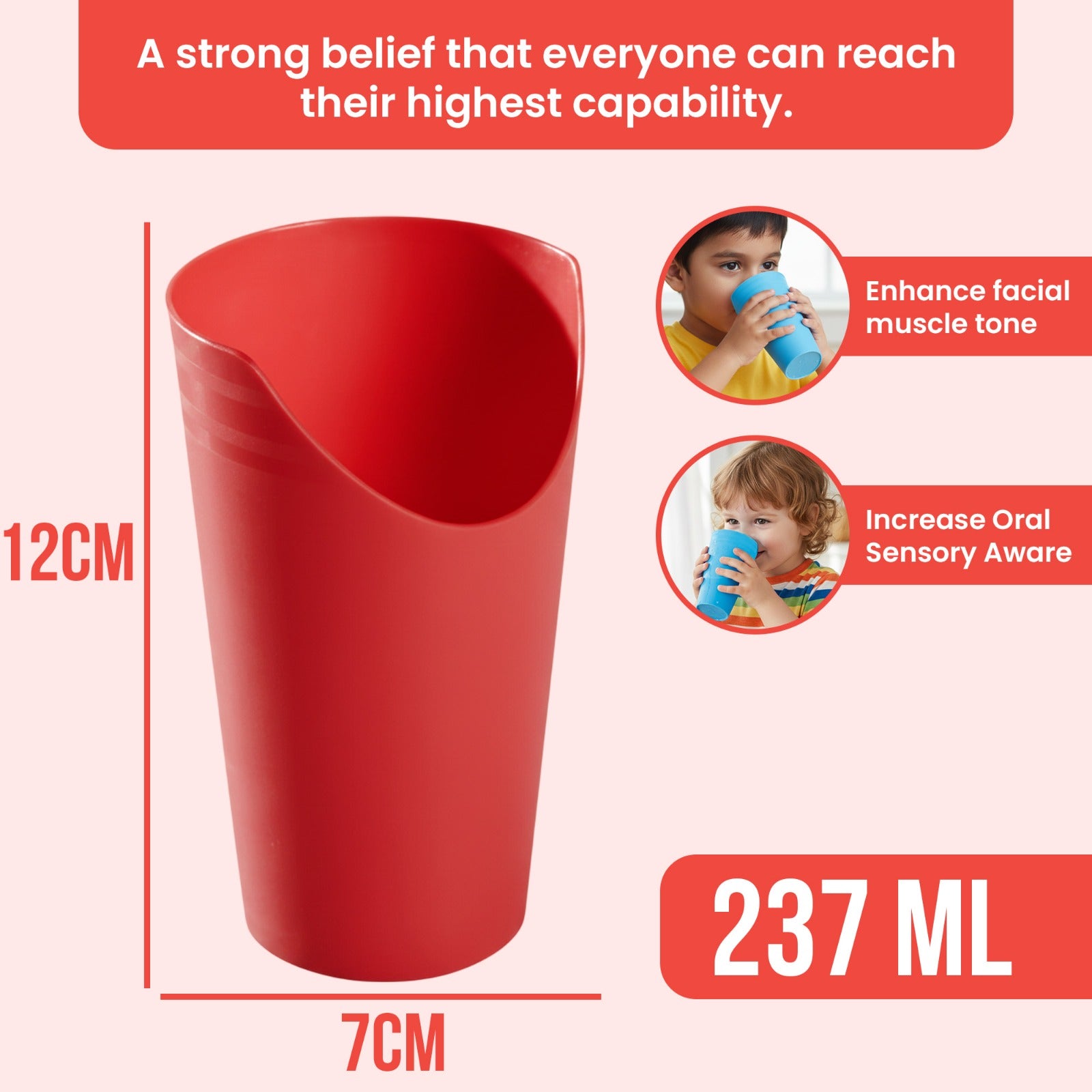 Unlike traditional cups that hit the bridge of the nose, the cut-out section provides clearance. This allows the liquid to flow into the mouth simply by tilting the cup, not the head. This mechanism is essential for proper oral motor therapy and safe feeding practices.