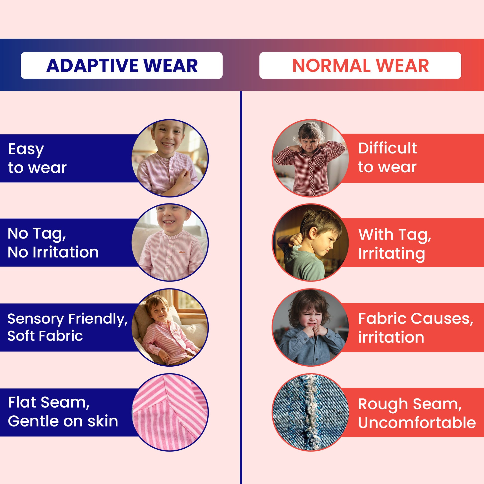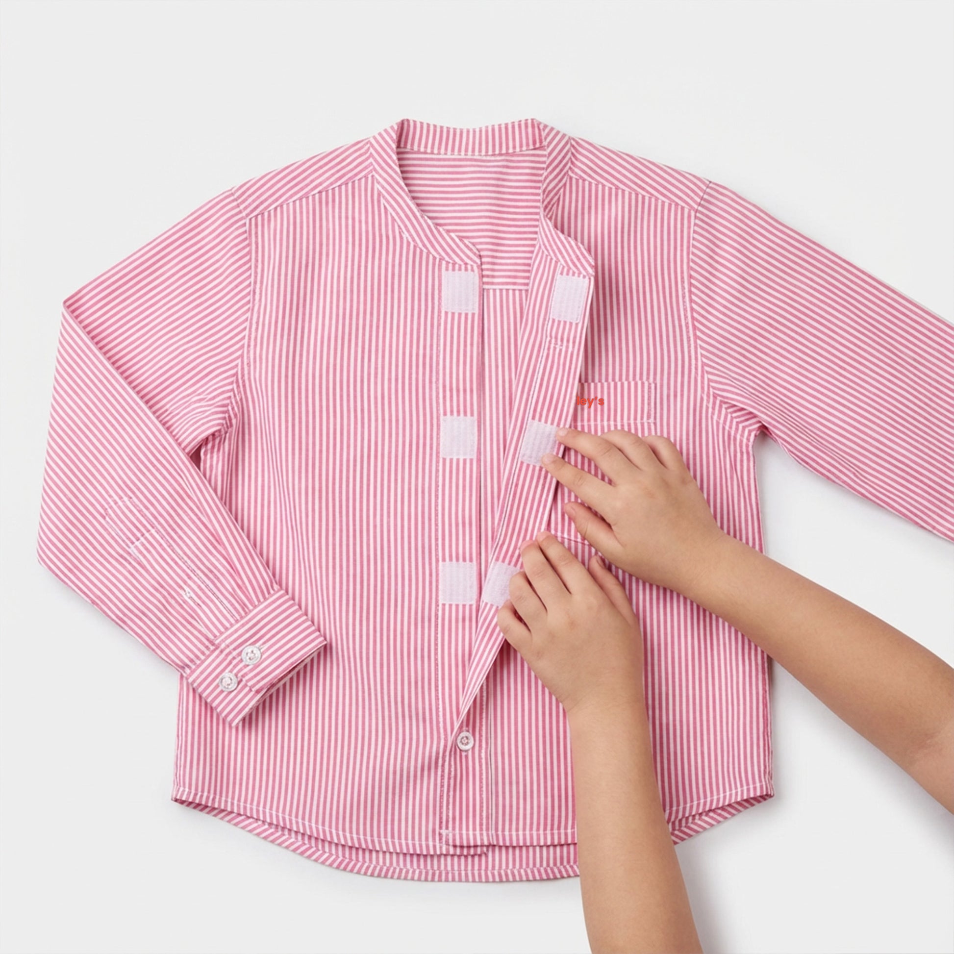 Unlike "Normal Wear" which requires complex fine motor skills to button up, our "Adaptive Wear" allows children to simply align the front and press to close. It promotes independence and reduces dressing time significantly!