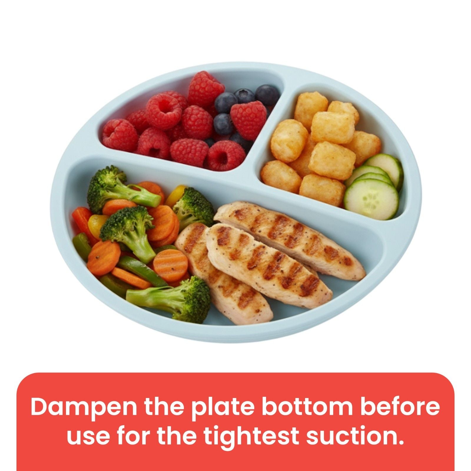 How It Works: Simply place the plate on a clean, flat surface and press down to engage the suction. The plate remains anchored while the user dines, providing a reliable surface for scooping and cutting. To release, gently lift the edge of the suction base. ๐ง